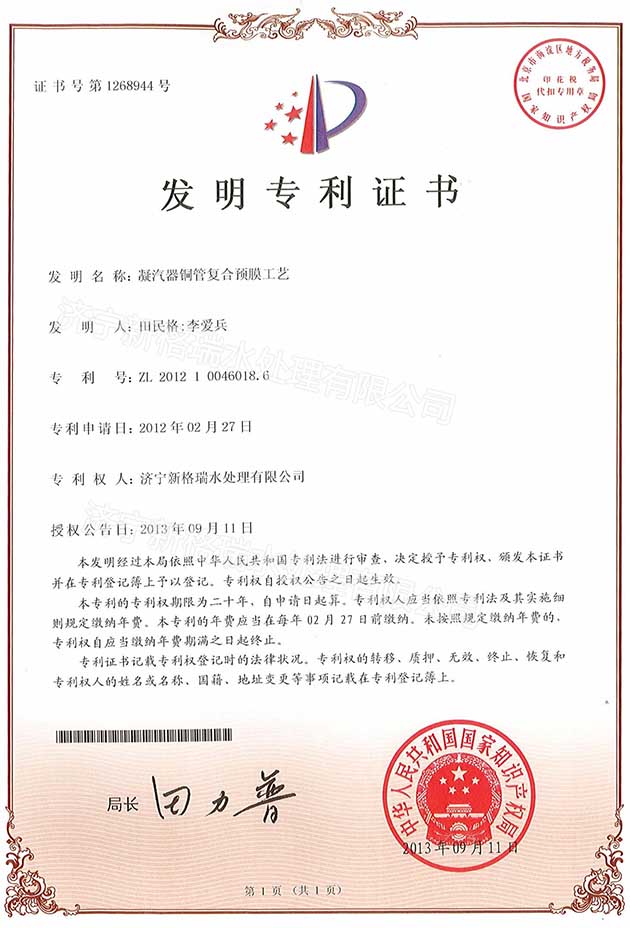 凝汽器銅管復(fù)合預(yù)膜工藝專利證書